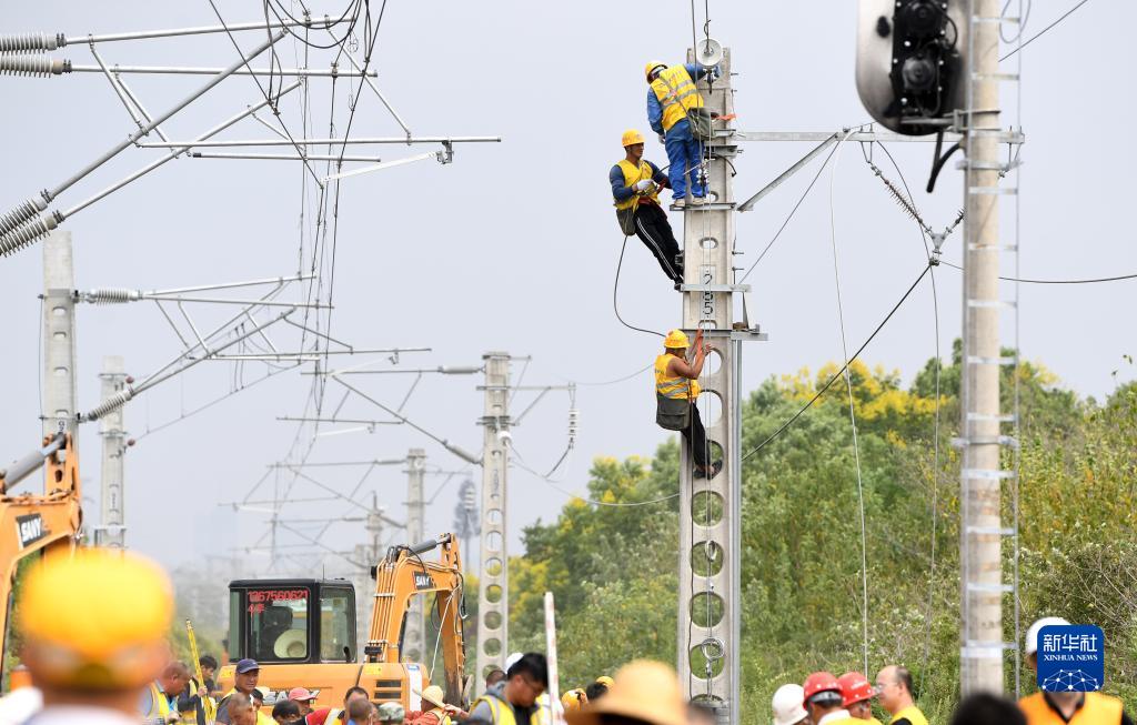 9月15日,施工人員在進(jìn)行接觸網(wǎng)施工作業(yè)。