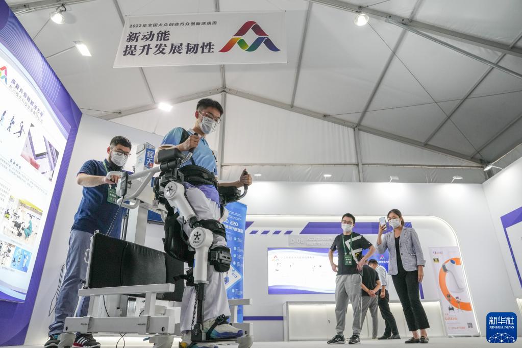 9月15日,在2022年全國大眾創(chuàng )業(yè)萬(wàn)眾創(chuàng )新活動(dòng)周合肥主會(huì )場(chǎng)的主題展區,來(lái)自杭州的程天科技發(fā)展有限公司展示其公司研發(fā)的下肢外骨骼步行康復器。