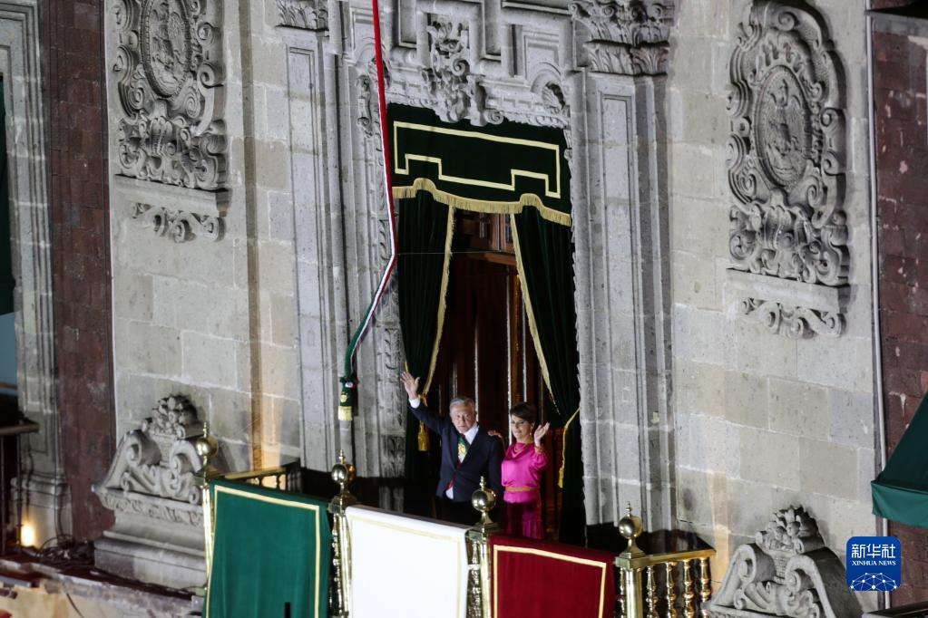9月15日,墨西哥總統洛佩斯(左)和夫人在首都墨西哥城的國家宮出席獨立日慶?;顒?dòng)時(shí)向民眾揮手致意。
