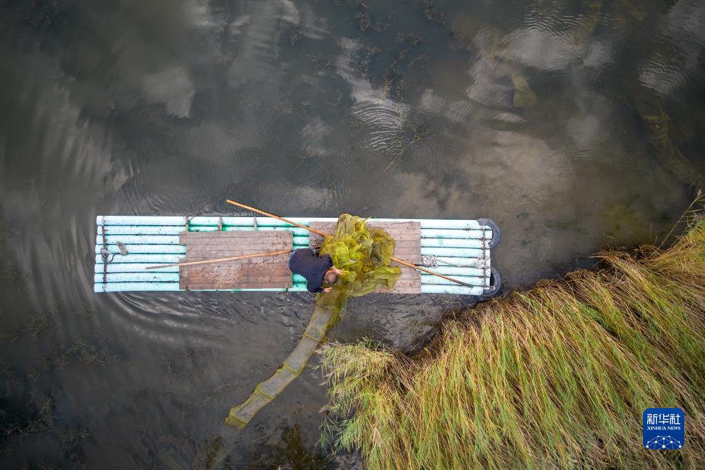 9月7日,李長(cháng)吉在富錦國家濕地公園內清理水中的老舊網(wǎng)具(無(wú)人機照片)。