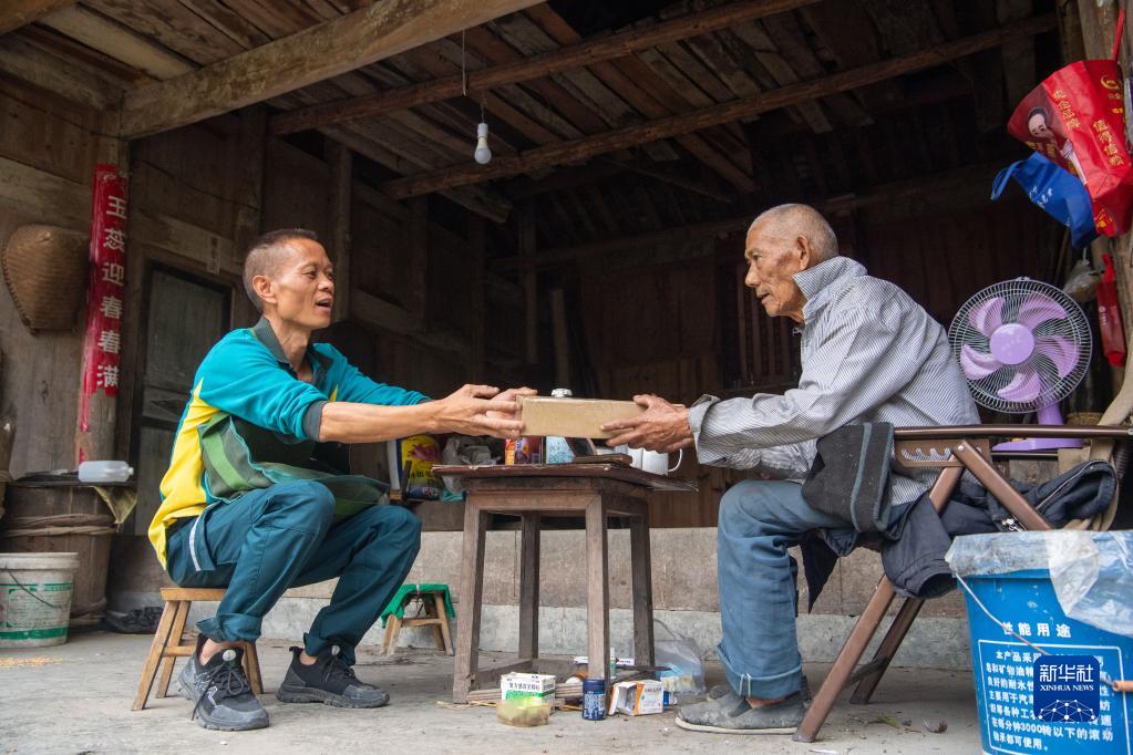 9月15日,投遞員張永洪(左)將快遞送到行動(dòng)不便的老人手中。