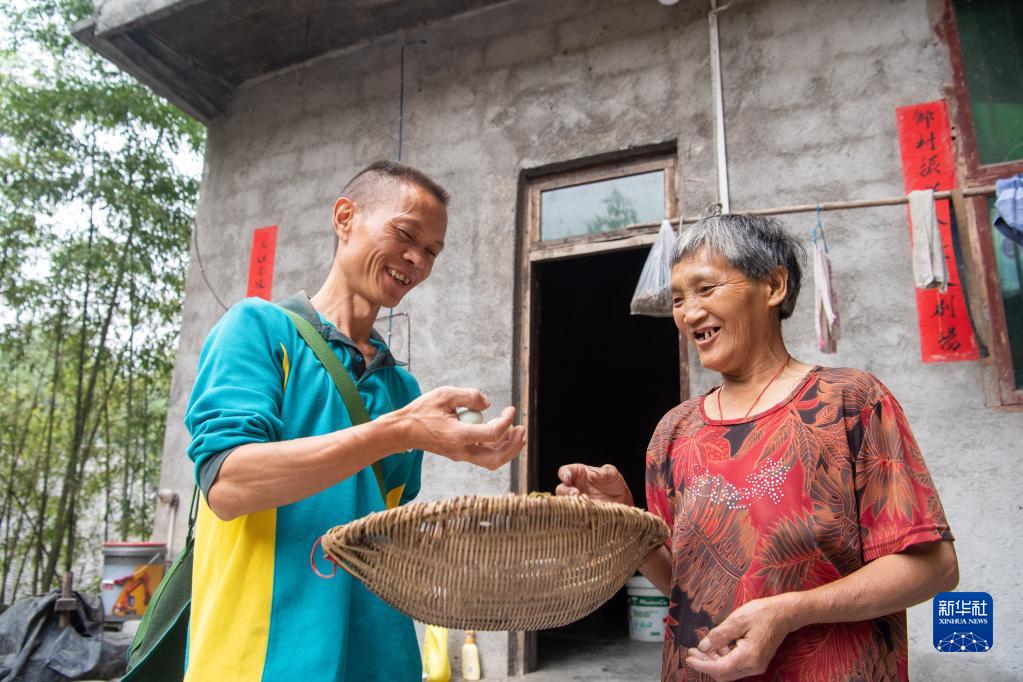 9月15日,投遞員張永洪(左)在村民家收取村民外銷(xiāo)的農產(chǎn)品。