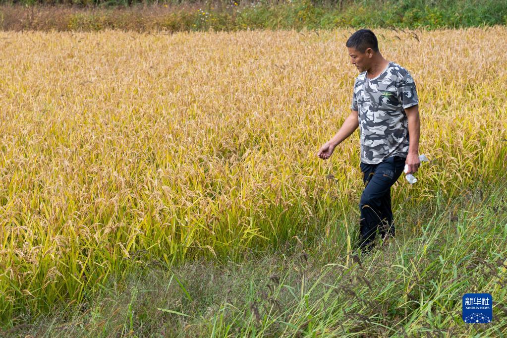 9月16日,村民在元寶村附近一片稻田中查看水稻長(cháng)勢。
