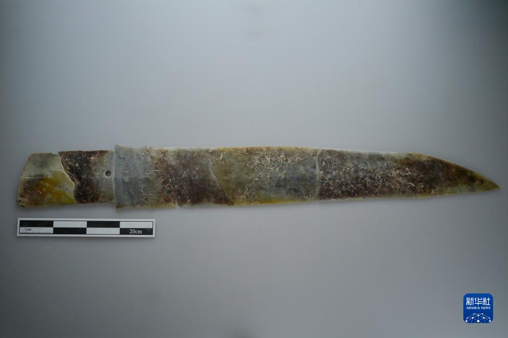 這是3月3日拍攝的鄭州商城遺址高等級貴族墓M2中出土的玉戈。