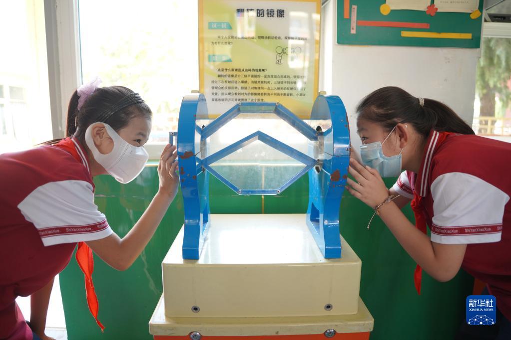 9月16日,河北省邢臺市內丘縣實(shí)驗小學(xué)學(xué)生在科技大篷車(chē)巡展活動(dòng)中體驗“翻轉的鏡像”。