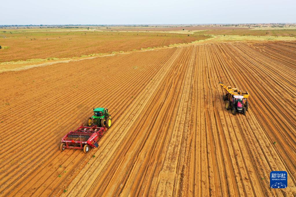 農機在杭錦旗阿木古龍健康產(chǎn)業(yè)園內收土豆(9月16日攝,無(wú)人機照片)。