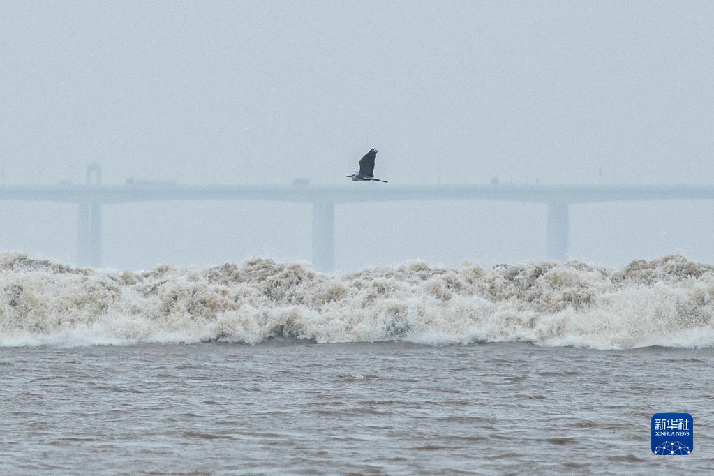 一只水鳥(niǎo)在錢(qián)塘江潮水上空飛舞(9月13日攝)。今年,受臺風(fēng)“梅花”影響,錢(qián)塘江在風(fēng)雨之中迎來(lái)大潮。