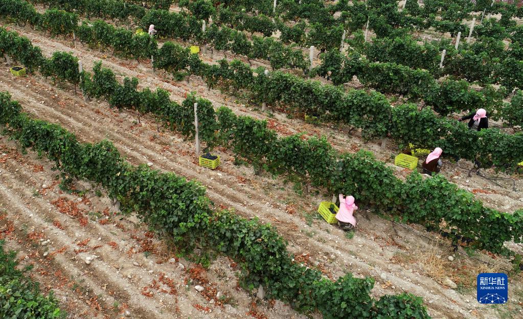 9月16日,工人在寧夏銀川市賀蘭山東麓的沃爾豐酒莊采摘釀酒葡萄(無(wú)人機照片)。