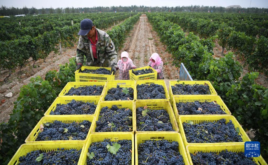 9月16日,工人在寧夏銀川市賀蘭山東麓的沃爾豐酒莊轉運釀酒葡萄。