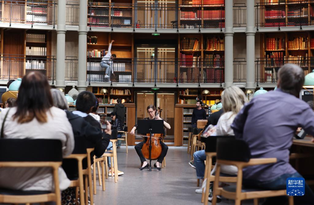 9月17日,在位于巴黎的法國國家圖書(shū)館黎塞留館,人們在“橢圓大廳”聆聽(tīng)大提琴家的表演。