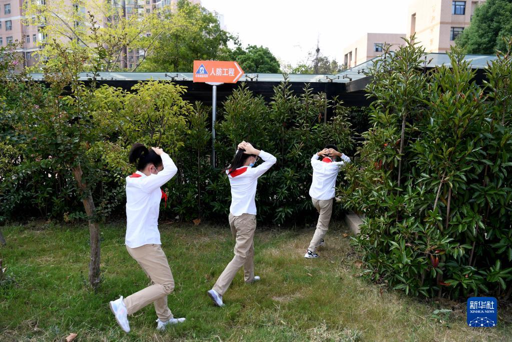 9月18日,合肥市朝霞小學(xué)的學(xué)生在疏散演練中進(jìn)入校園里的人防工程。