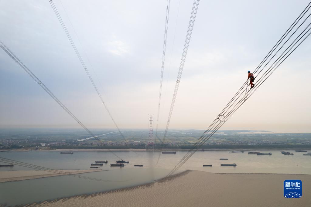 9月18日,在位于湖南省岳陽(yáng)市臨湘市的南荊長(cháng)特高壓工程螺山長(cháng)江大跨越施工現場(chǎng),國網(wǎng)山東送變電工程有限公司工作人員調整間隔棒(無(wú)人機照片)。