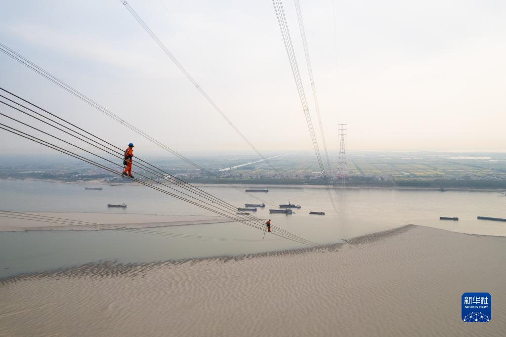 9月18日,在位于湖南省岳陽(yáng)市臨湘市的南荊長(cháng)特高壓工程螺山長(cháng)江大跨越施工現場(chǎng),國網(wǎng)山東送變電工程有限公司的工作人員調整間隔棒(無(wú)人機照片)。