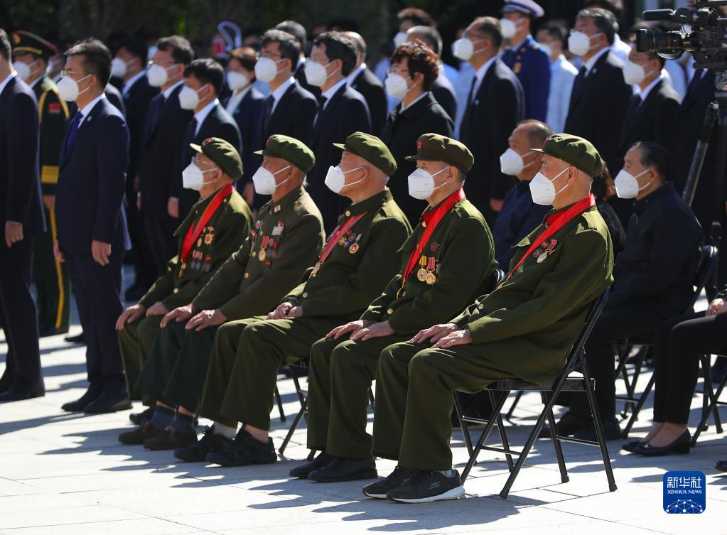 9月18日,參加過(guò)抗日戰爭的老戰士代表在勿忘九一八撞鐘鳴警儀式現場(chǎng)。