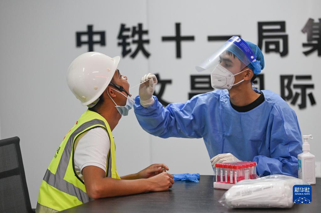 9月17日,工人在位于海南文昌的衛星總裝測試廠(chǎng)房項目部接受核酸檢測。