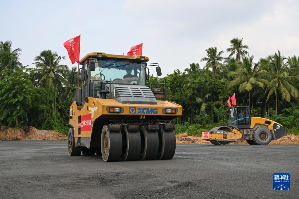 9月14日,工人在文昌國際航天城起步區“三橫五縱”路網(wǎng)工程項目工地施工。