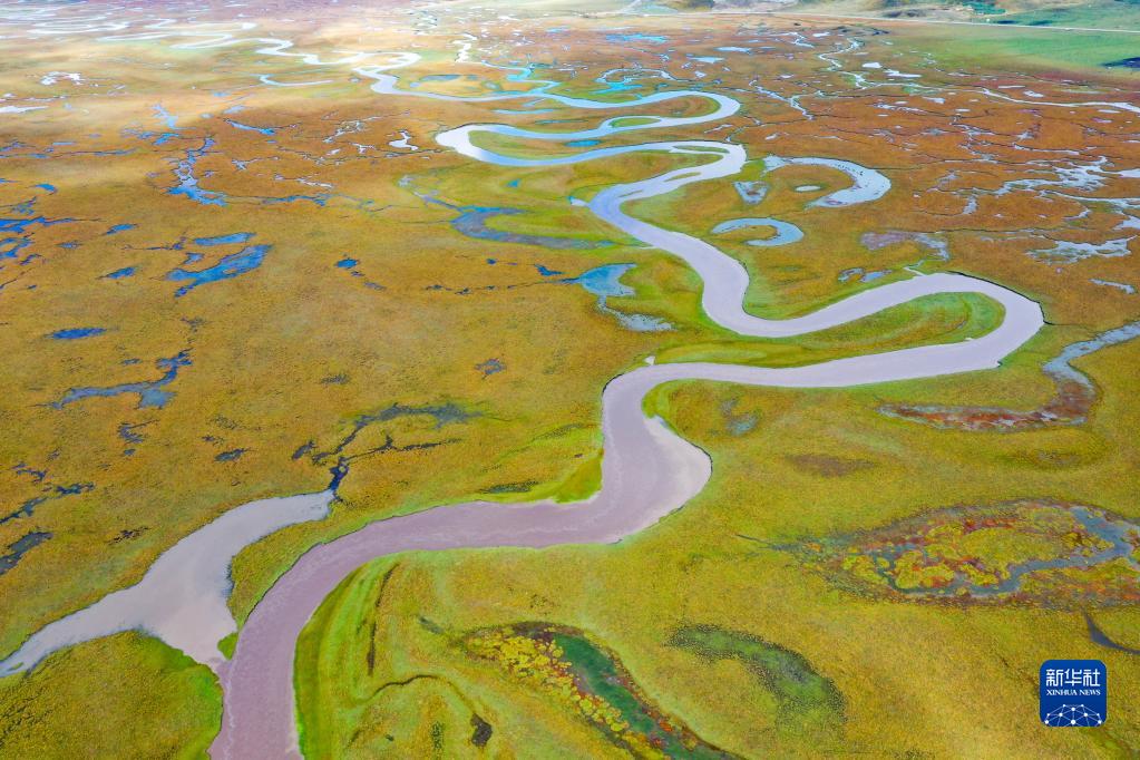 這是瑪曲縣阿萬(wàn)倉濕地內的河流和沼澤(9月17日攝,無(wú)人機照片)。