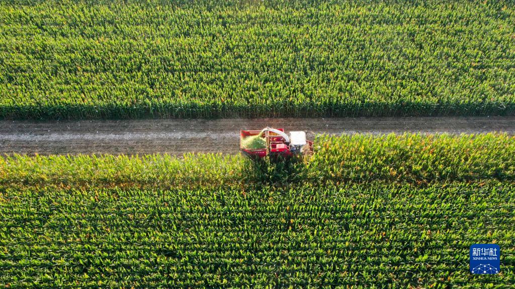9月18日,河北省遵化市東新莊鎮后毛莊村的農民駕駛農機在田間收割玉米秸稈(無(wú)人機照片)。