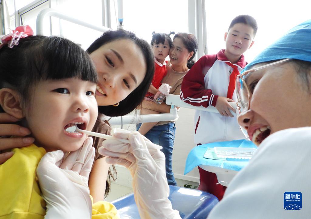 9月19日,在四川省達州市人民廣場(chǎng)“外賣(mài)快遞小哥暖心之家”,市中心醫院口腔科醫生在為一名小朋友檢查牙齒。