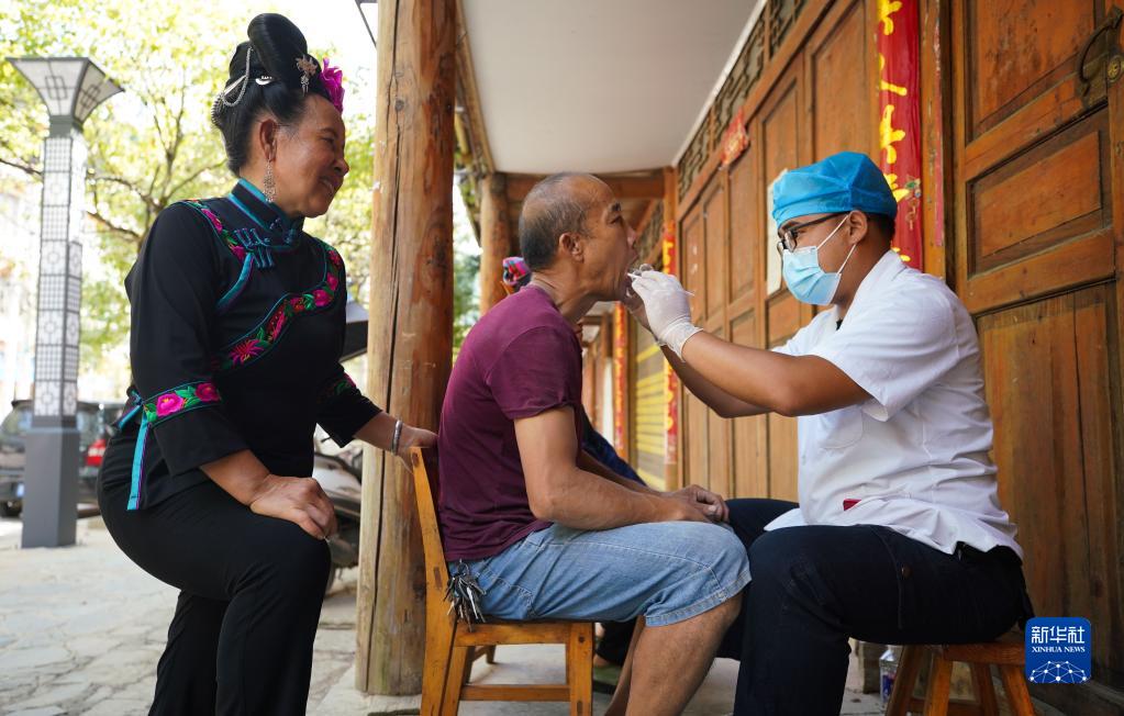9月19日,村醫張震在貴州省黔東南苗族侗族自治州丹寨縣排調鎮排調村為村民檢查牙齒。