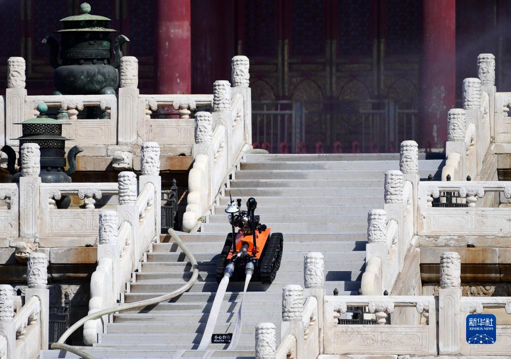 9月19日,消防機器人在故宮太和殿前進(jìn)行消防演練。
