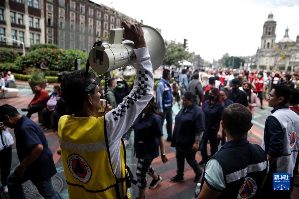 9月19日,在墨西哥首都墨西哥城,民防人員引導室外避險的民眾。