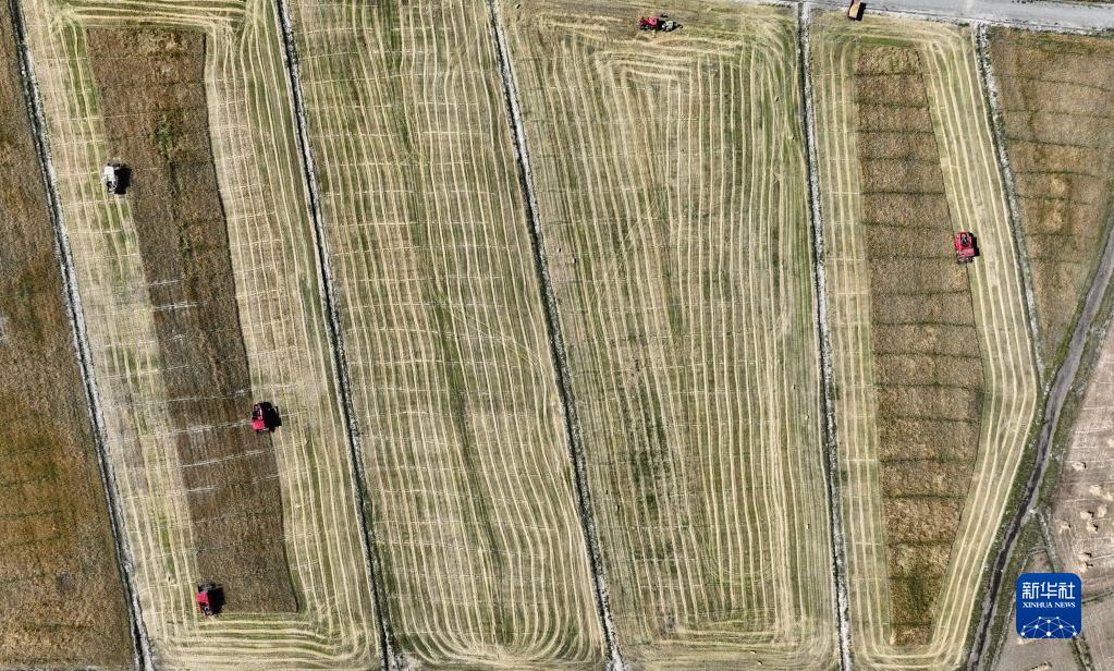 西藏日喀則市江孜縣熱索鄉努康村農機合作社的村民集中對村里三千多畝耕地進(jìn)行機械化收割(9月19日攝,無(wú)人機照片)。