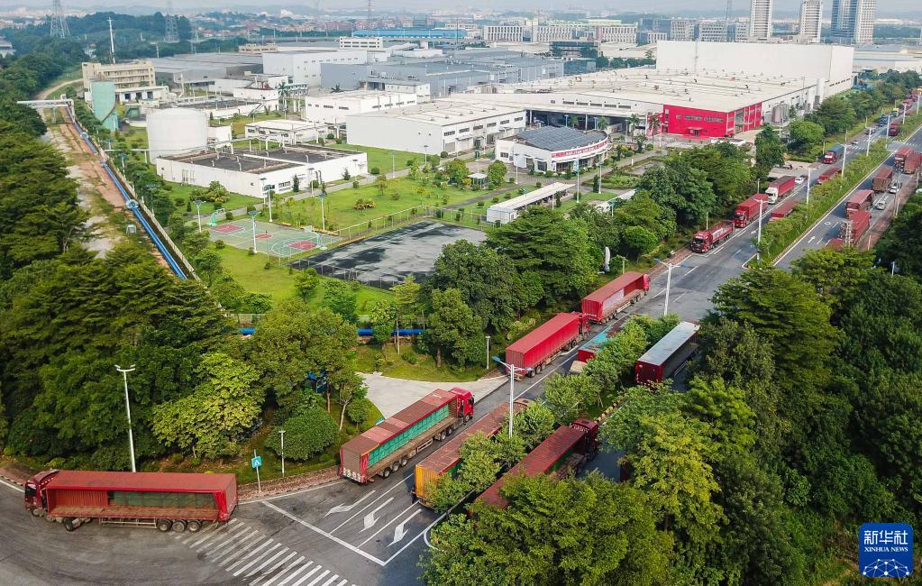 三水“水都基地”的企業(yè)外停滿(mǎn)物流卡車(chē),園區巨大的飲料食品產(chǎn)能需要高效物流配套,也壯大了一批專(zhuān)業(yè)物流企業(yè)(9月17日攝,無(wú)人機照片)。