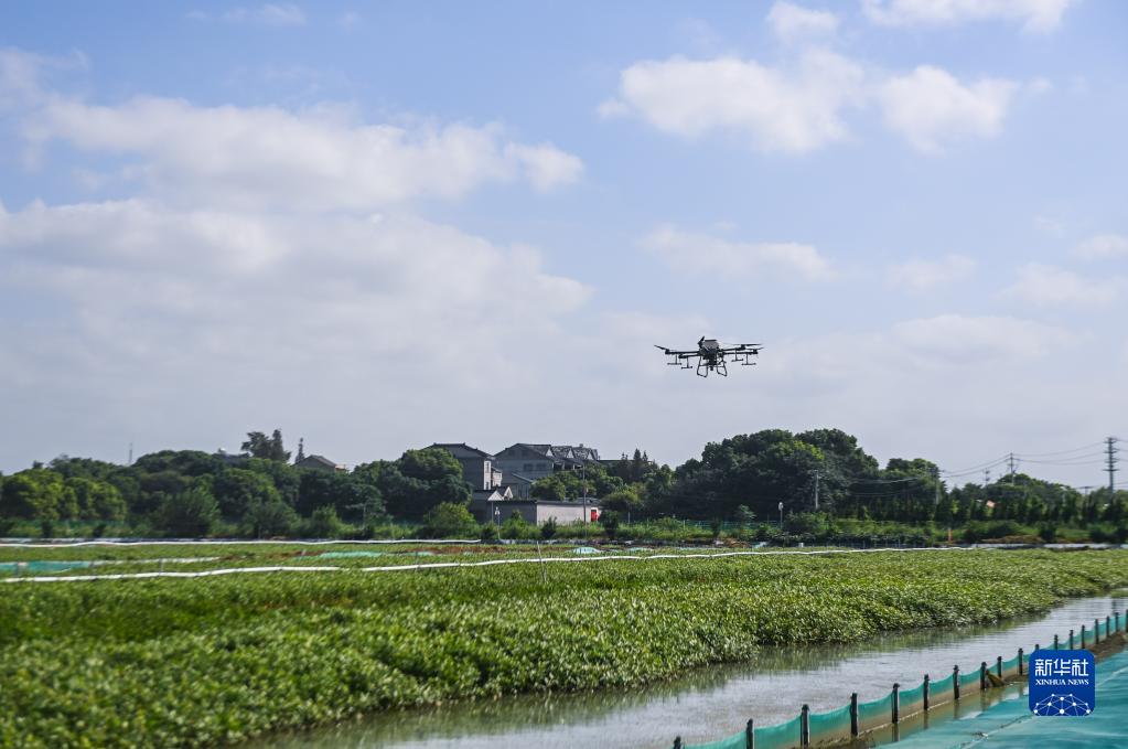 9月20日,在位于織里鎮喬溇村的溇港人家太湖蟹生態(tài)養殖基地內,無(wú)人機起飛給螃蟹喂食。