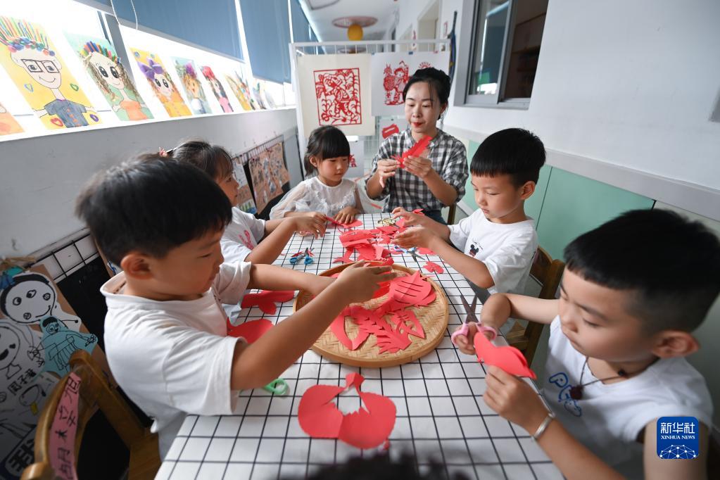 9月20日,老師指導孩子們剪出稻穗、蘿卜、青菜等農作物的剪紙作品。