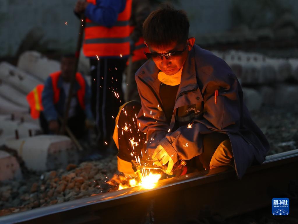9月19日,施工人員在遼寧朝陽(yáng)南站站改封鎖施工現場(chǎng)切割鐵軌。