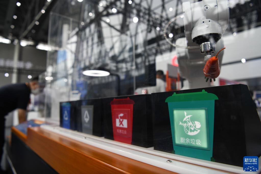 9月20日拍攝的2022世界制造業(yè)大會(huì )上展出的一款垃圾分類(lèi)機器人。