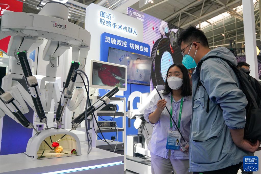 9月20日,在第七屆中國-亞歐博覽會(huì )上,參觀(guān)者在微創(chuàng )機器人展位了解腔鏡手術(shù)機器人。