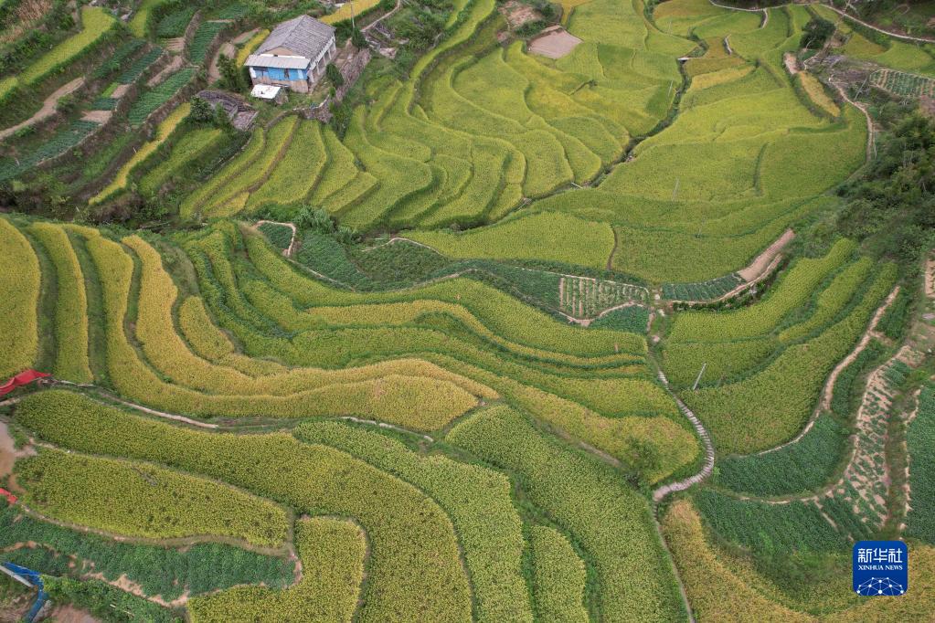 9月15日在浙江省瑞安市林川鎮英山村拍攝的進(jìn)入成熟期的水稻(無(wú)人機照片)。