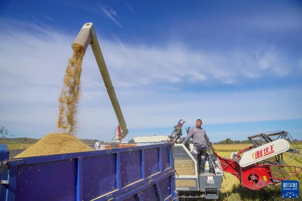 9月20日,在吉林省長(cháng)春市九臺區龍嘉農樂(lè )種植家庭農場(chǎng),農民操作農機將收獲的水稻送入拖拉機。