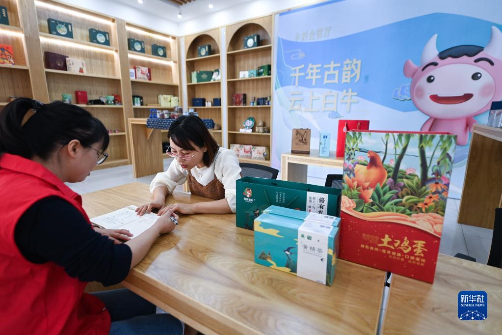 9月21日,在杭州市臨安區昌化鎮白牛村電商大樓的農創(chuàng )客中心,張青(右)與昌化鎮黨員志愿者討論直播培訓計劃。張青回鄉聯(lián)合當地青年志愿者組建“云上白?!ね乃C”特色電商平臺,組織“農創(chuàng )客”開(kāi)展直播培訓。