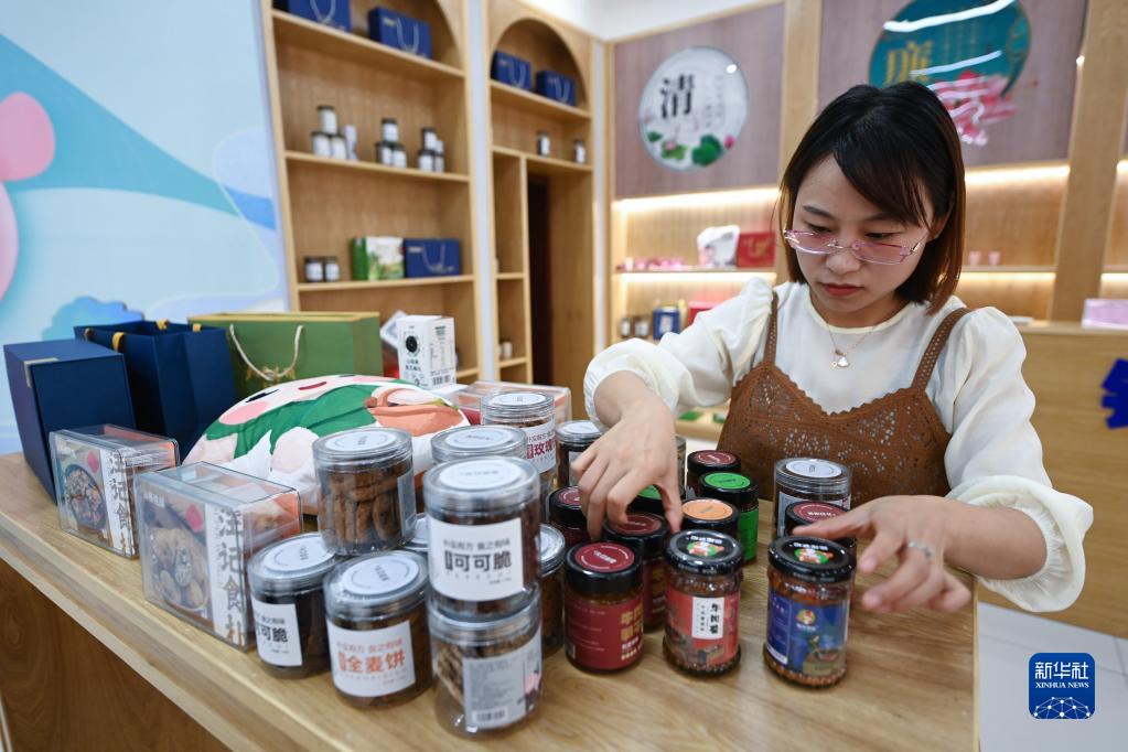 9月21日,在杭州市臨安區昌化鎮白牛村電商大樓的農創(chuàng )客中心,張青整理要進(jìn)行直播銷(xiāo)售的特色農產(chǎn)品。張青回鄉聯(lián)合當地青年志愿者組建“云上白?!ね乃C”特色電商平臺,組織“農創(chuàng )客”開(kāi)展直播培訓。
