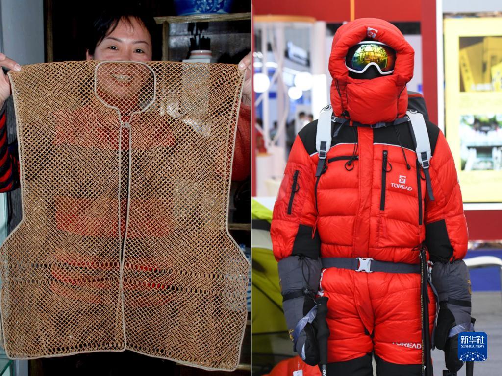 這是一張拼版照片:左圖為2009年1月3日在江西省婺源縣拍攝的清代竹衣馬甲(王國紅攝);右圖為2022世界制造業(yè)大會(huì )上展出的一款填充了高科技材料的服裝(新華社記者周牧2022年9月20日攝)。