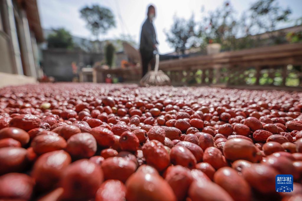 9月21日,河北省玉田縣孤樹(shù)鎮青石塘村的農民在庭院晾曬金絲小棗。