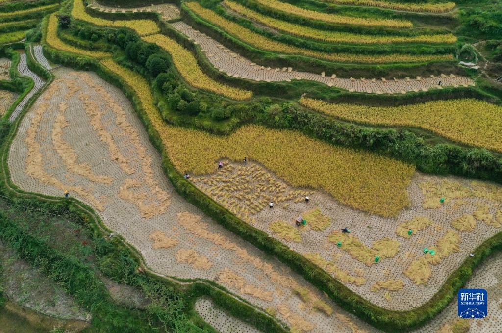 9月20日,貴州省黔東南苗族侗族自治州丹寨縣雅灰鄉上叢村村民在收獲水稻(無(wú)人機照片)。