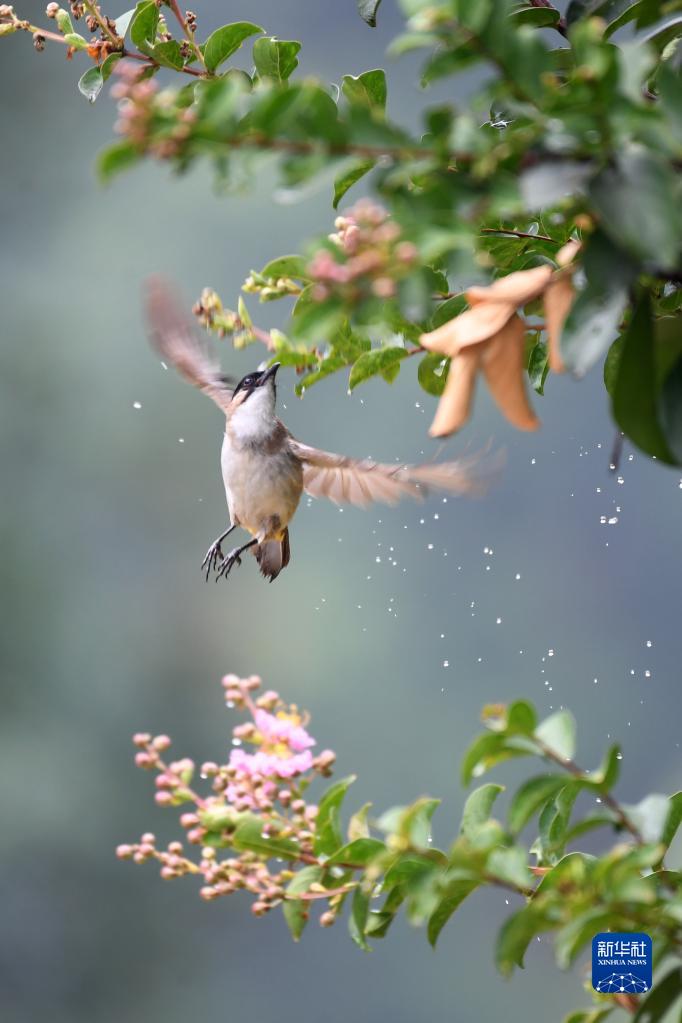 貴州省仁懷市一公園內,飛舞的小鳥(niǎo)在秋雨后的花枝間蕩起水珠(9月12日攝)。