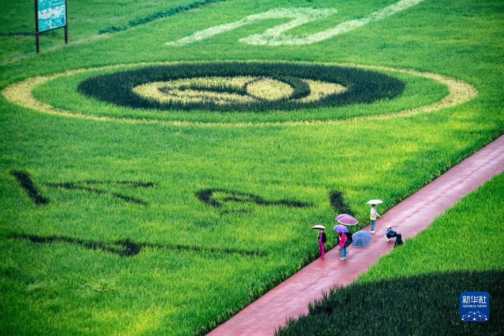 近日,重慶市大足區拾萬(wàn)鎮長(cháng)虹村隆平五彩田園豐收在即,巨型稻田畫(huà)勾勒出金秋壯美景象,吸引眾多游客前來(lái)打卡游玩。