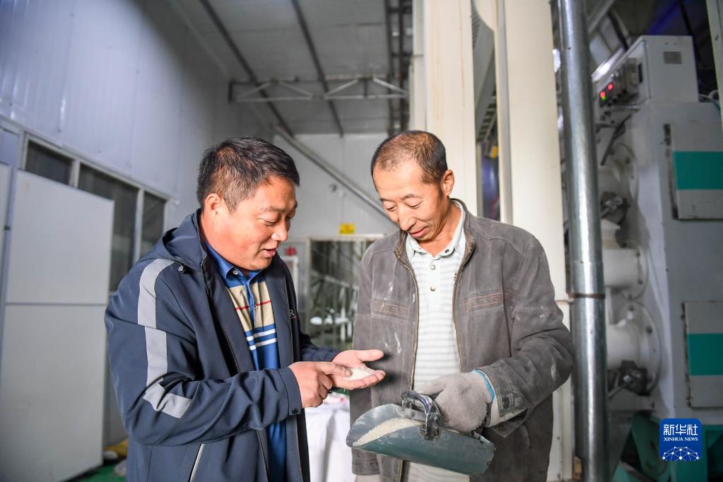 9月22日,內蒙古興安盟烏蘭浩特市義勒力特鎮的明武水稻種植專(zhuān)業(yè)合作社社員查看加工好的大米質(zhì)量。