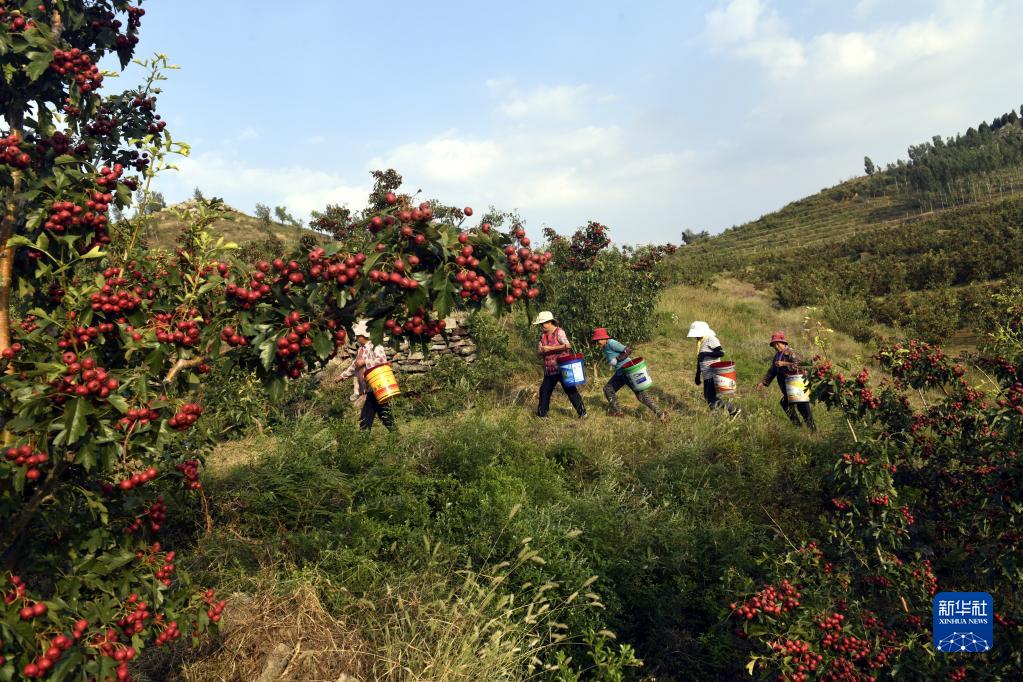 9月21日,新泰市劉杜鎮極品山楂家庭農場(chǎng),工人上山采摘山楂。