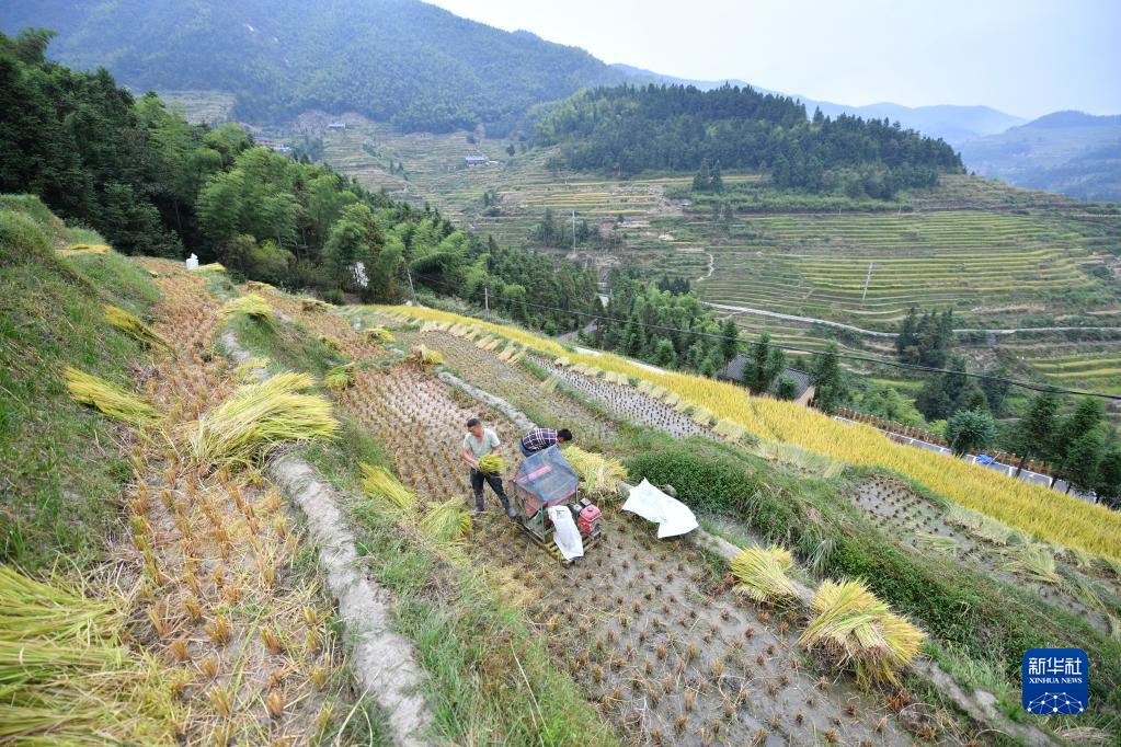 9月22日,村民在紫鵲界梯田勞作。