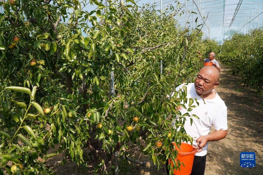 9月22日,在山東省濱州市沾化區下洼鎮的大棚冬棗種植園,棗農在采摘成熟的冬棗。