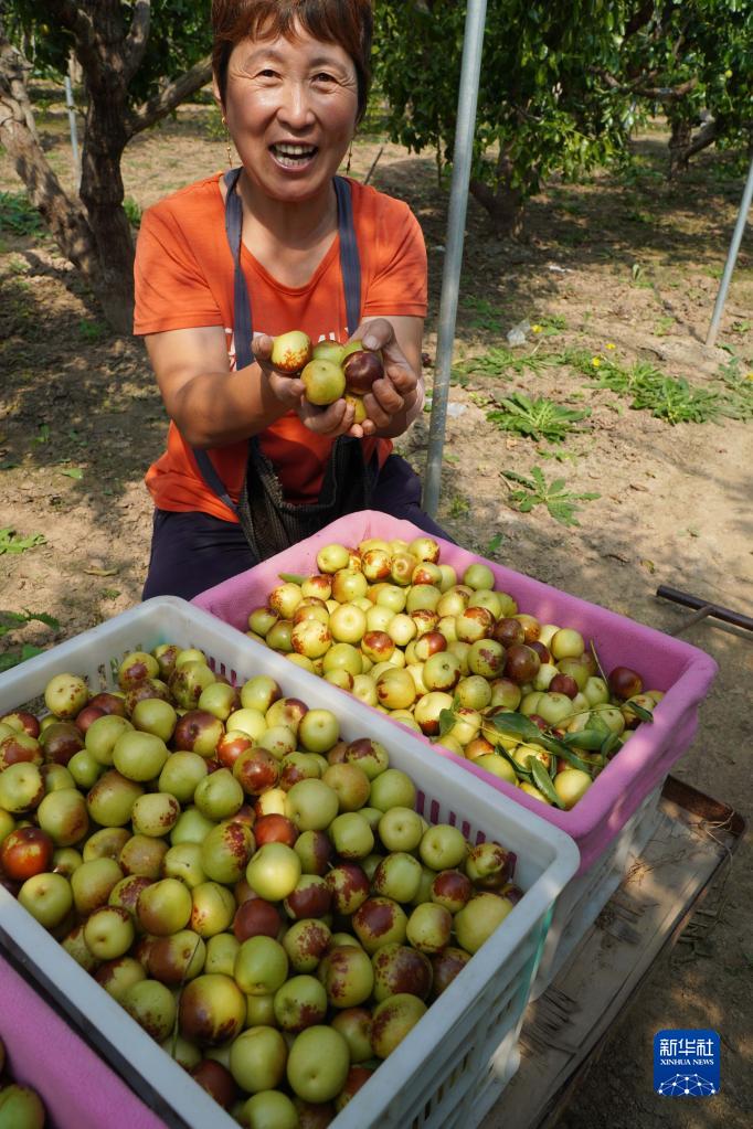 9月22日,在山東省濱州市沾化區下洼鎮的大棚冬棗種植園,棗農展示剛采摘的冬棗。