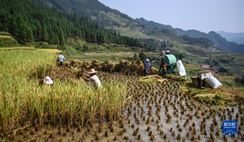 9月22日,融水苗族自治縣紅水鄉良隴村村民在由國鐵南寧局幫扶發(fā)展的稻魚(yú)綜合養殖田收稻谷(無(wú)人機照片)。