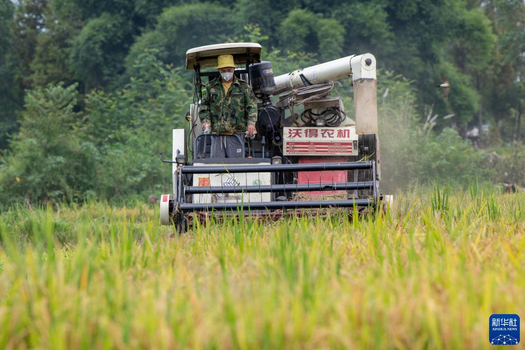 時(shí)值秋收,農業(yè)大省四川省各地農田里一片繁忙的收割景象。