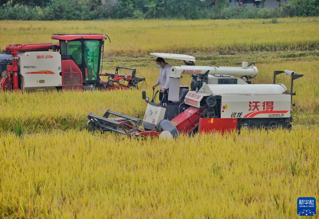 時(shí)值秋收,農業(yè)大省四川省各地農田里一片繁忙的收割景象。